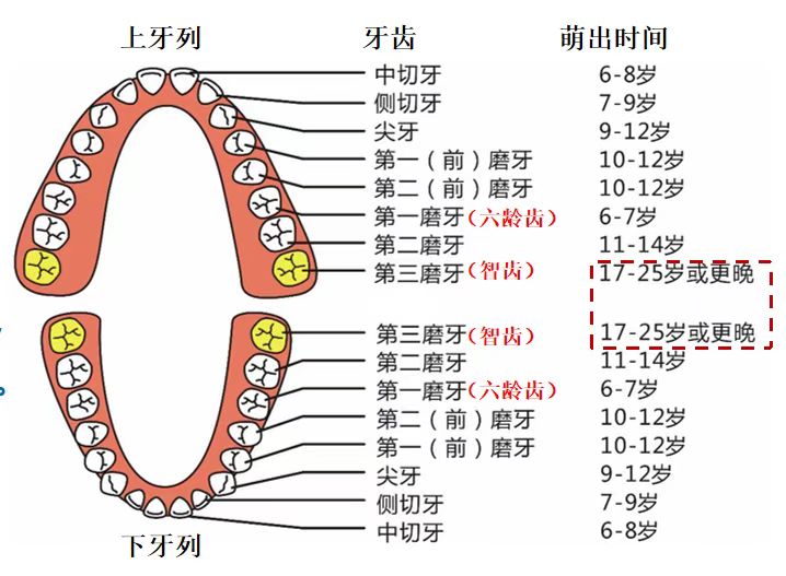 智齒通常在人的青少年末期至二十多歲期間開始萌發,但也有個體差異,有的人終生智齒不萌出,而有的人則可能在四十歲後才出現。智齒的萌發過程可能順利無阻,也可能因為空間不足而導致「阻生」或「埋伏」,這時智齒只能部分露出或完全無法露出牙齦表面,進而引起一系列問題,包括: