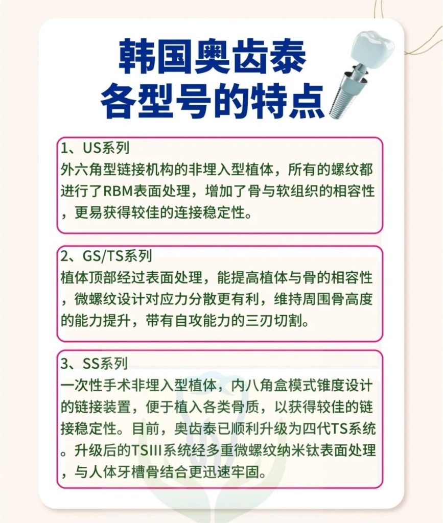 总结嚟讲,韩国奥齿泰嘅种植体系用咗纯钛材料,加上特别嘅表面处理技术,令到佢喺生物相容性、稳定性同舒适度等方面都表现出色,系一个值得信赖嘅种植体品牌。