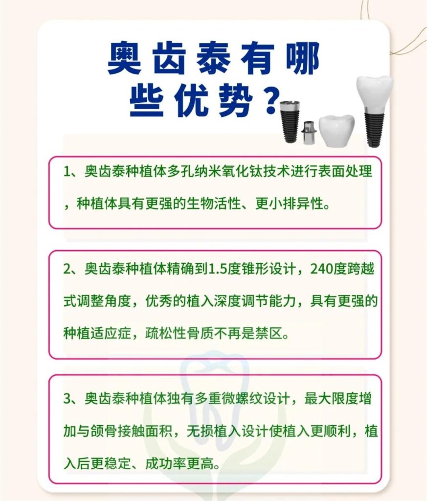 - 优于传统修复方法的临床效果:与传统常规镶牙方法相比,奥齿泰种植修复牙齿缺失的临床效果更佳,能有效提升种植成功率,减少术后牙龈出血、牙痛等症状,提高牙齿美观度 。此外,奥齿泰种植技术在牙列缺损修复中的治疗效果理想,值得推广使用 。
